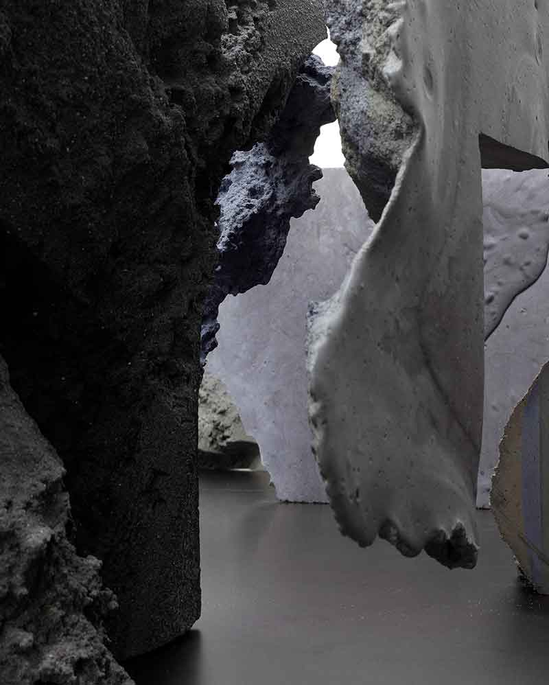 Dans la serie Barbar, Anne Holtrop reprend une même typologie de formes définies par des lignes droites et des arcs, se rassemblant en un vague motif, un langage atmosphérique qui rappelle le Temple Barbar. Anne Holtrop s’était déjà inspiré de ce temple pour la création du pavillon du Bahreïn à l’Exposition Universelle de Milan, un bâtiment composé de 350 formes uniques blanches en moulage de béton, qui s’imbriquent comme un puzzle et forment les espaces intérieurs et les jardins. Dans le prolongement de cette réflexion autour des formes, il produit une nouvelle série d’œuvres pour Solo Galerie : Floor, une œuvre en marbre rose posée à même le sol et la maquette du Barbar Pavilion où l’on retrouve son procédé d’empreinte de la matière.
