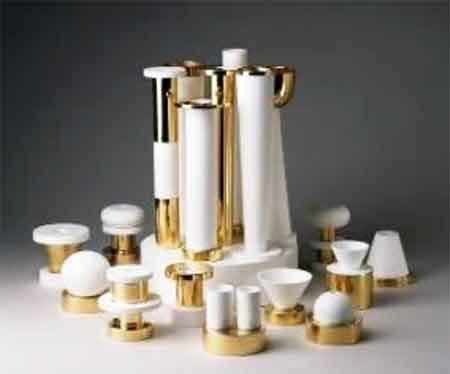 Invité en 1993 à la Manufacture de Sèvres, Sottsass dessine une série de quatorze vases aux couleurs subtiles, aux lignes géométriques portant des prénoms d’héroïnes féminines historiques, mythologiques ou littéraires (Lolita, Cléopâtre, Joséphine, Salomé…). Cet ensemble est complété par cet étonnant surtout blanc et or aux formes tournées constituant de véritables architectures de table.